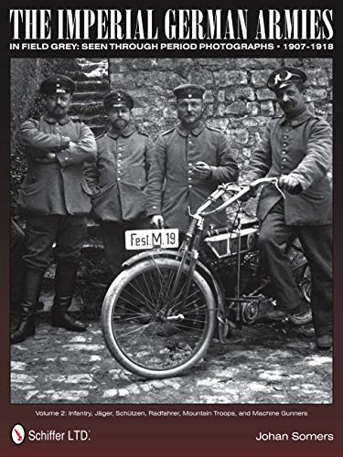 - The Imperial German Armies in Field Grey Seen Through Period Photographs • 1907-1918: Volume 2: Infantry, Jager, Schutzen, Radfahrer, Mountain Troops, and Machine Gunners These books present in detail the field-grey uniforms, helmets, weapons, and equipment used before and during the First World War. The origin and the many formations in existence at the outbreak of the war, and newly raised will be outlined, followed by a section on uniforms. The many carefully selected black and white war-era photos with large and complete captions will give the reader a thorough understanding of the appearance of the German Army during World War I. Each branch of service is lavishly illustrated with over 3000 black and white, and color photographs. The three volumes cover: uniforms, headgear, weapons, gas warfare, telephone and communications equipment, infantry, jäger, schützen, radfahrer, mountain troops, machine gunners, cavalry, artillery, pioneers, transport, train, medical, and miscellaneous formations.
